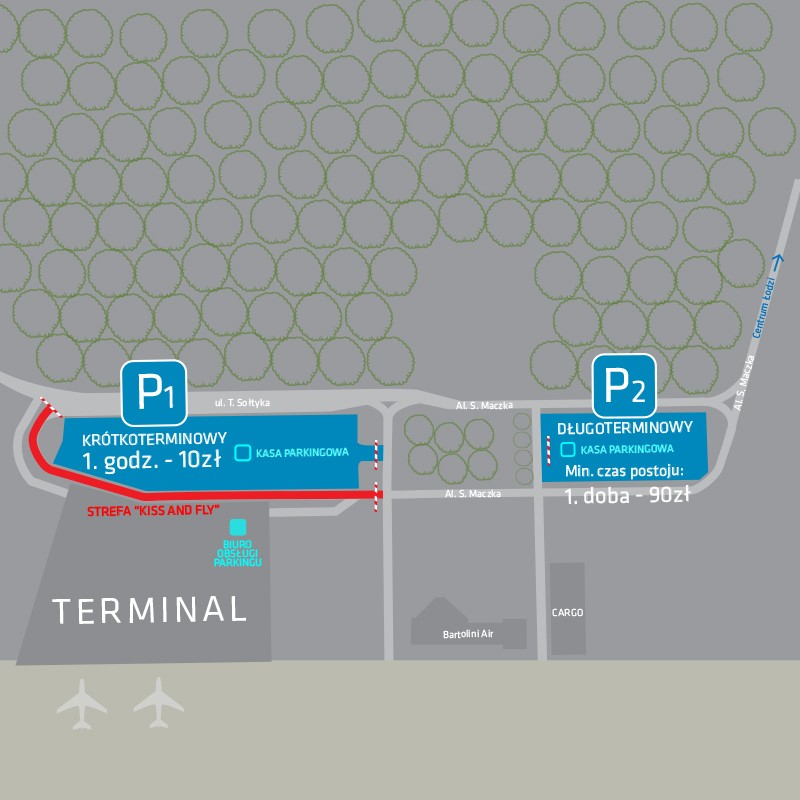 Fragment ulicy pomiędzy terminalem a parkingiem krótkoterminowym (za szlabanami) to strefa Kiss&Fly. Przeznaczona jest do krótkiego zaparkowania w celu podwiezienia lub odebrania podróżnych z bagażami. W tej strefie zatrzymują się taksówki i - na osobnym pasie - autobusy miejskie 65A i 65B.